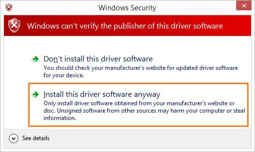 8. Jika muncul peringatan Windows can't verify the publisher of this driver software, klik Install this driver software anyway
